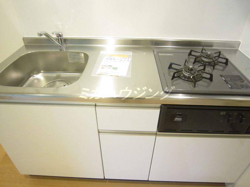 ★キッチンは2口コンログリル付♪自炊派にオススメです!玄関からはキッチンが丸見えになるので、気になる方はパテーション等目隠しをするとよさそう^^