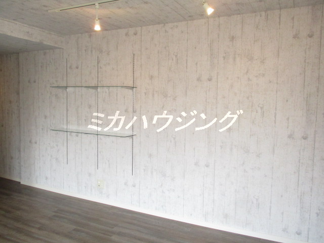 ★コンクリ打放し風のクロス、照明はスポットライトでオシャレな雰囲気☆可動式棚も新設しました!