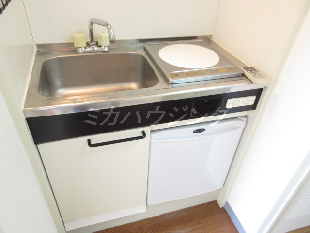 ★キッチンはお手入れが楽なIHヒーター、調理スペースはないので料理をしない人向きですね。ミニ冷蔵庫付なので、初めての一人暮らしにオススメ
